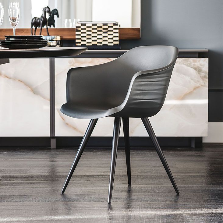 Кресло из мягкого полиуретана с различными базами. Вращающаяся или фиксированная база из стали, покрытой прозрачной краской (OP0), либо окрашенной в гофрированный титан (GFM11), графитовый (GFM69), белый (GFM71) или черный (GFM73) цвет или база может быть выполнена в натуральном буке (F1), буке, окрашенном в орех (FNC)или обоженный дуб (RB), или состоять из 5 опорных элементов из глянцевого алюминия или алюминия, окрашенного в матовый черный с колесиками. Сиденье из однотонного полиуретана, доступного в цветах: белый bianco (P01), лён lino (P02), земляной fango (P03), бензин petrolio (P04) или антрацит antracite (P05), либо биколор с обратной стороной цвета "бензин" petrolio (P04) и передней в цвете "земляной" fango (P03). Доступны также другие цвета, при поставке 50 и более штук. Новая база из 4 опорных элементов из нейлона в цветах графит, белый и черный доступна во вращающейся версии (401-T) и с колесиками (401 -C). Сиденье огнеупорное 1 IM - CRIB5.