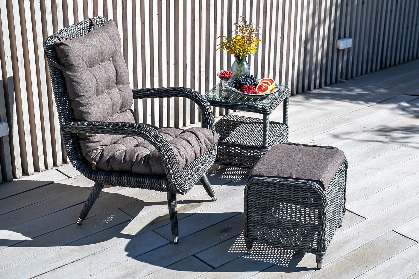 Размер модели – 690×810×990 мм. При изготовлении ее каркаса используется прочный алюминий с высокой износостойкостью. Имеет ручное плетение, которое выполнено из искусственного ротанга в цвете графит.