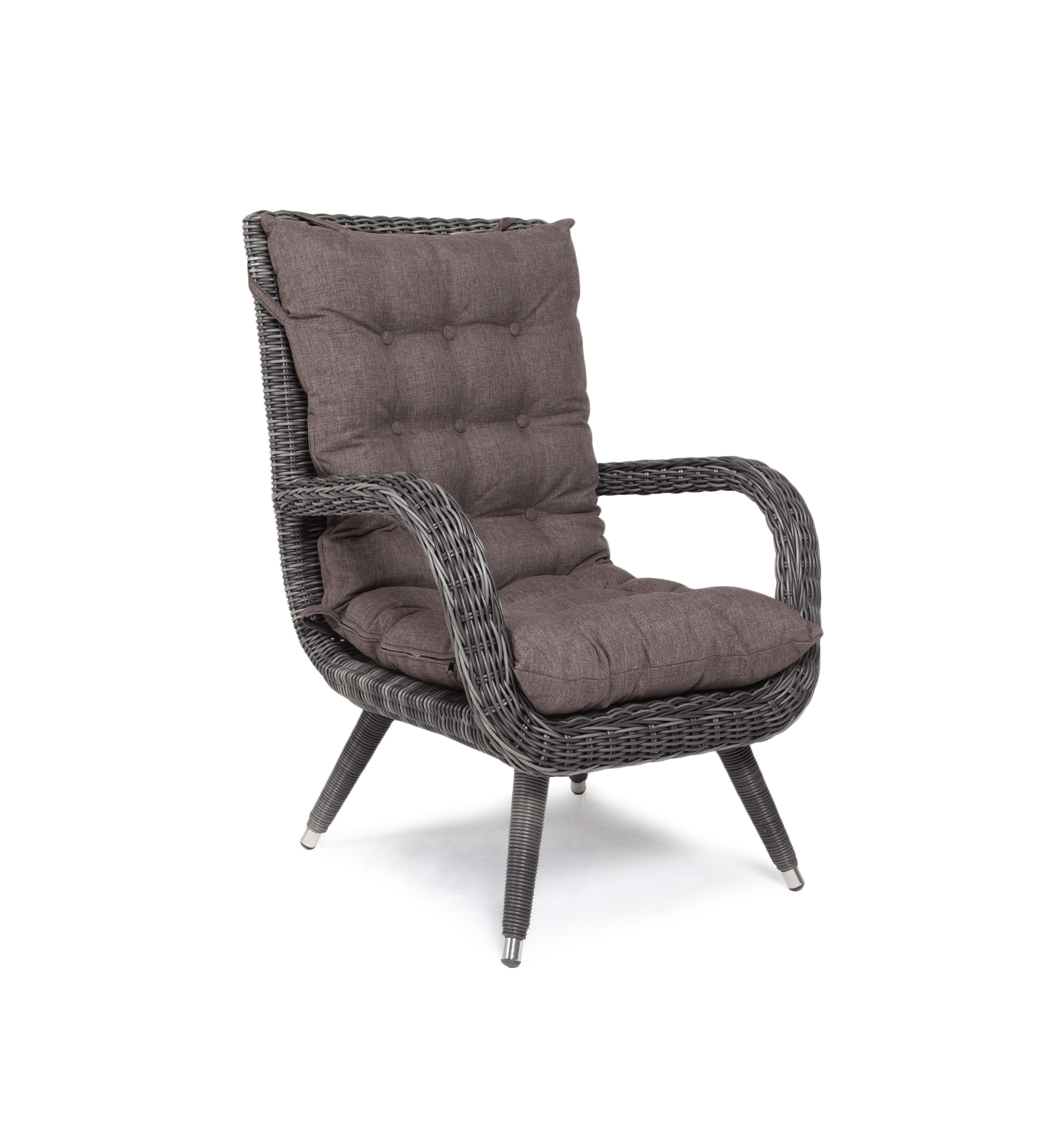 Садовое кресло дополнено мягкими подушками для комфортного размещения. Они выполнены в серо-коричневом цвете. При их пошиве используется полиэстер с плотностью 230гр/м2. Влагоотталкивающая пропитка усиливает защитные свойства материала.