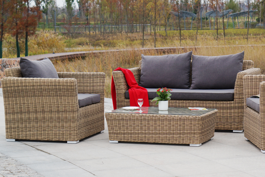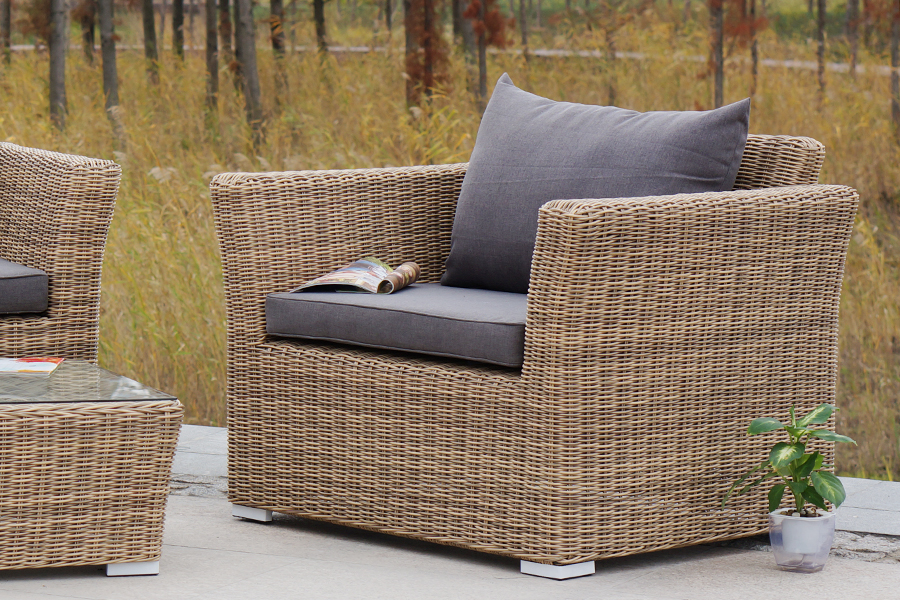 Прочный алюминиевый каркас усиливает устойчивость мебели. Его дополняет соломенная оплетка, которая представлена из круглого искусственного ротанга.
