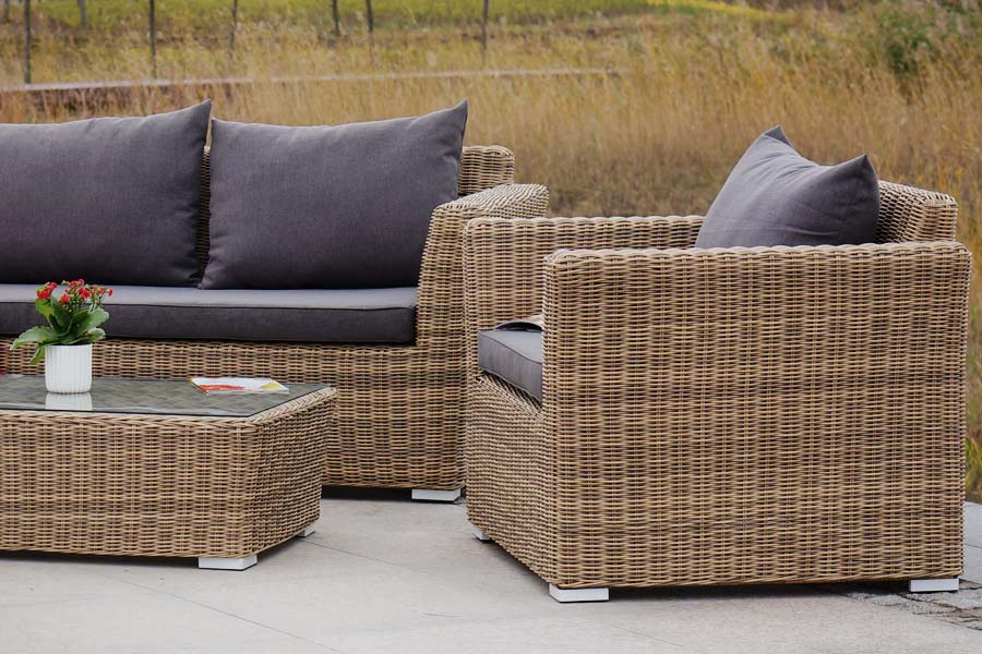Прочность каркасу мебели обеспечивает алюминий. Из искусственного ротанга соломенного оттенка создана оригинальная ручная оплетка, которая выступает в качестве основного декора.
