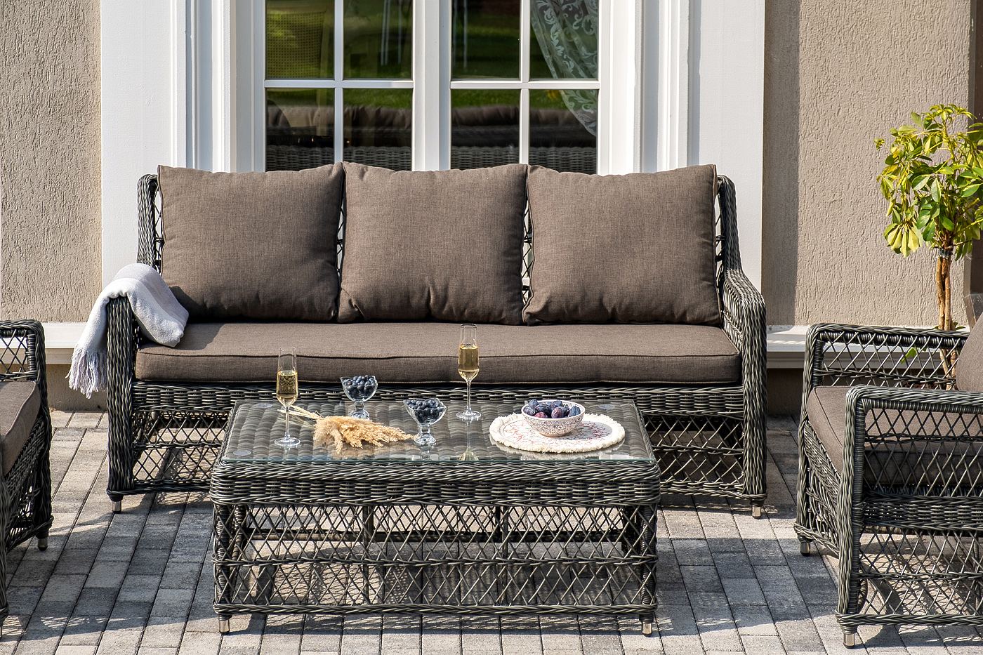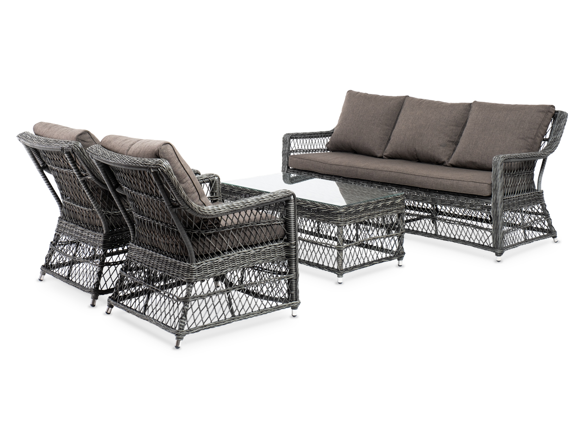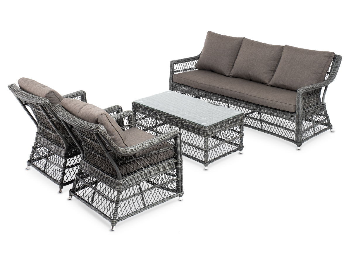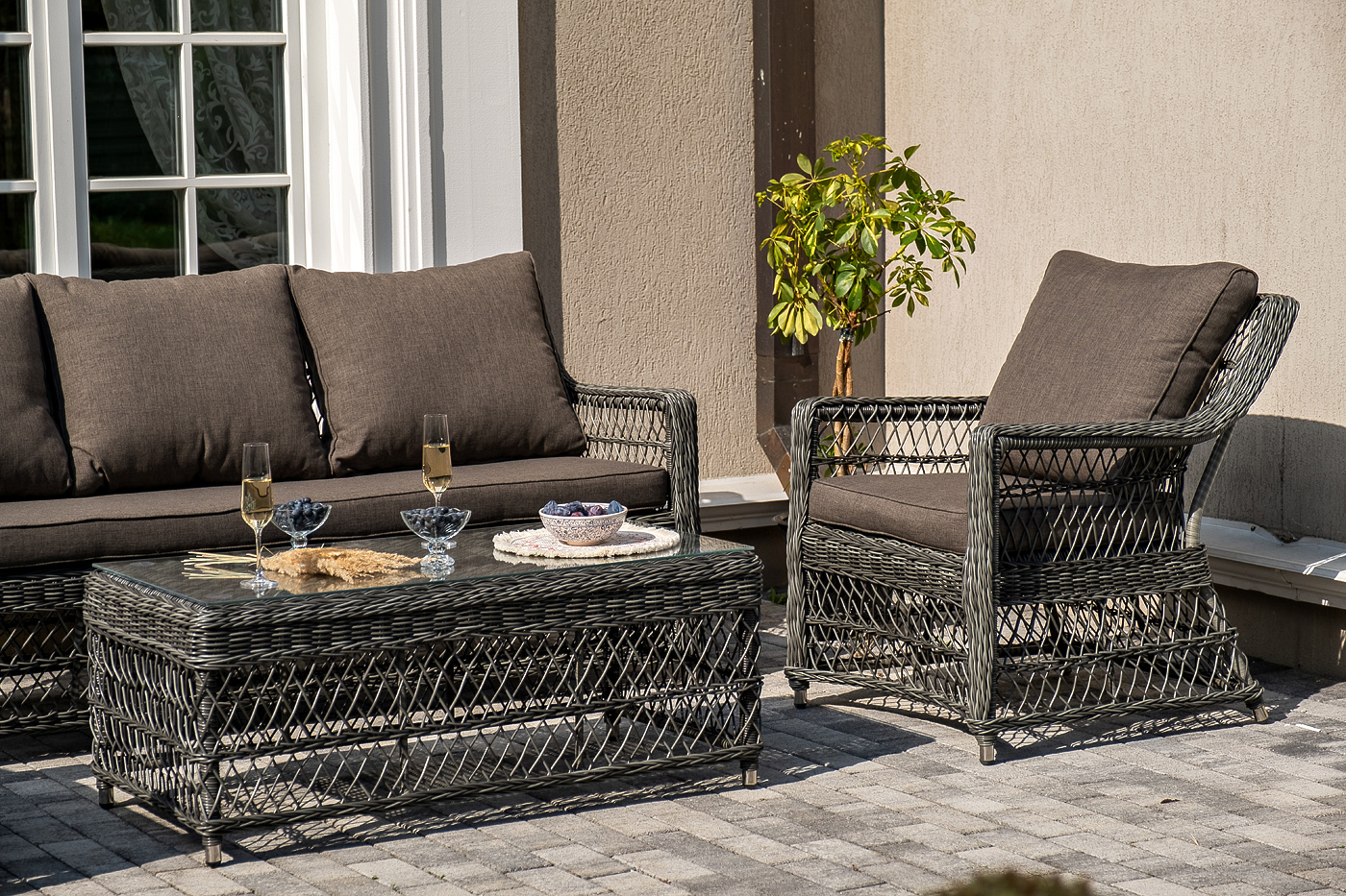 Уличная мебель имеет алюминиевый каркас с ручным плетением из искусственного ротанга в цвете "графит". Предусмотрены мягкие подушки из полиэстера серо-коричневого цвета с плотностью 230гр/м2. Они имеет влагоотталкивающую пропитку. Рабочая поверхность столика изготовлена из закаленного стекла толщиной 5 мм.