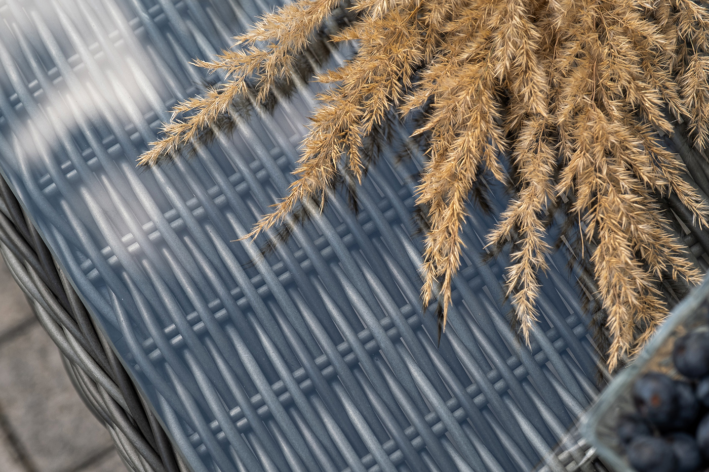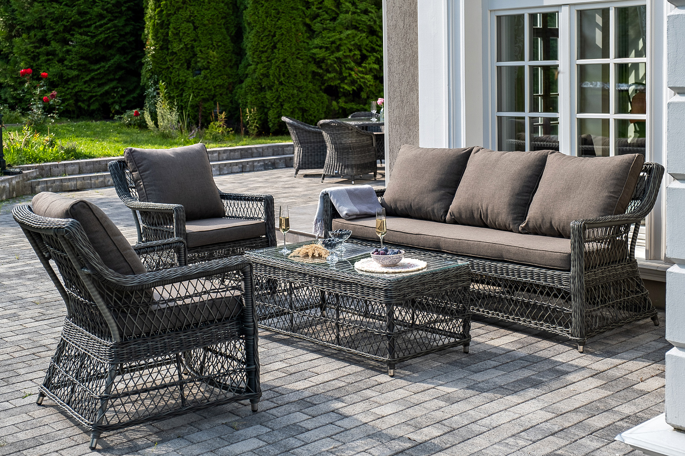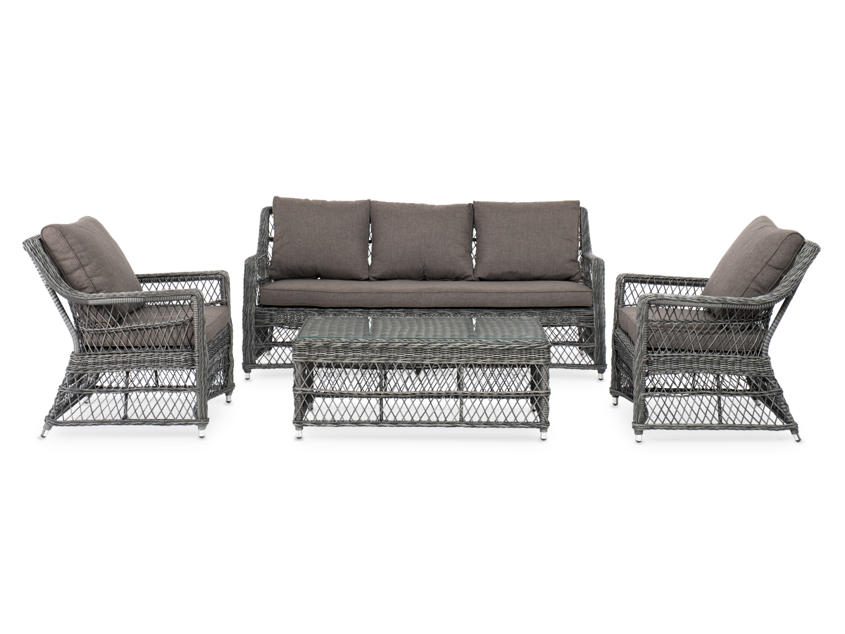 Уличная мебель имеет алюминиевый каркас с ручным плетением из искусственного ротанга в цвете "графит". Предусмотрены мягкие подушки из полиэстера серо-коричневого цвета с плотностью 230гр/м2. Они имеет влагоотталкивающую пропитку. Рабочая поверхность столика изготовлена из закаленного стекла толщиной 5 мм.