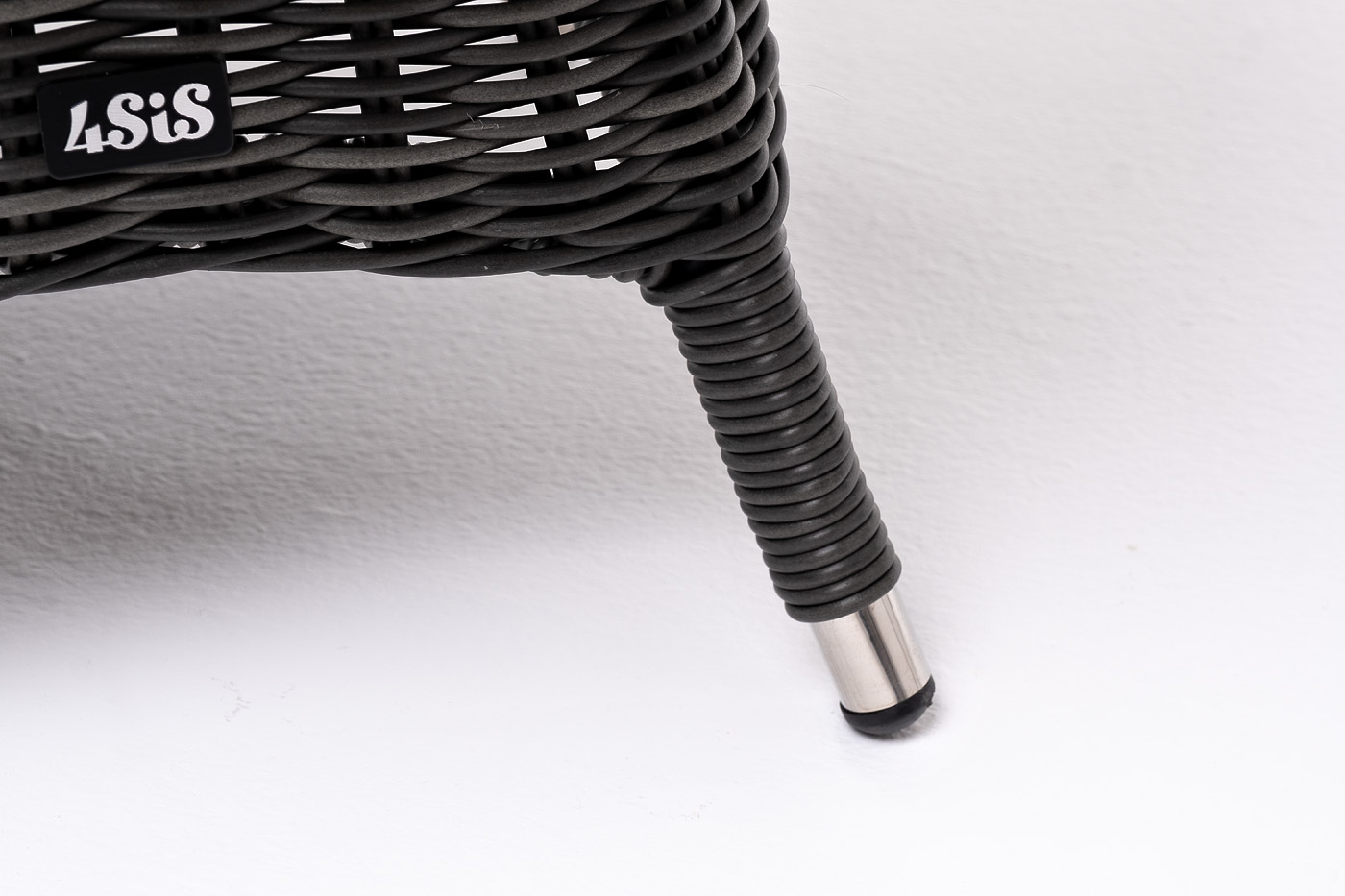 Размер модели – 600×600×480 мм. Столик располагает прочным каркасом, который изготовлен из качественного алюминия, отвечающий за надежное расположение конструкции. Весь каркас оплетен вручную круглым искусственным ротангом графитового цвета.